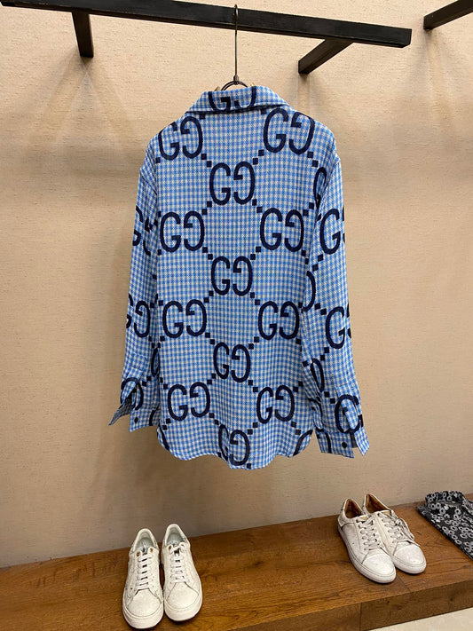 Gucci, 2024SS spring and summer new styles Haze blue fine plaid long-sleeved shirt